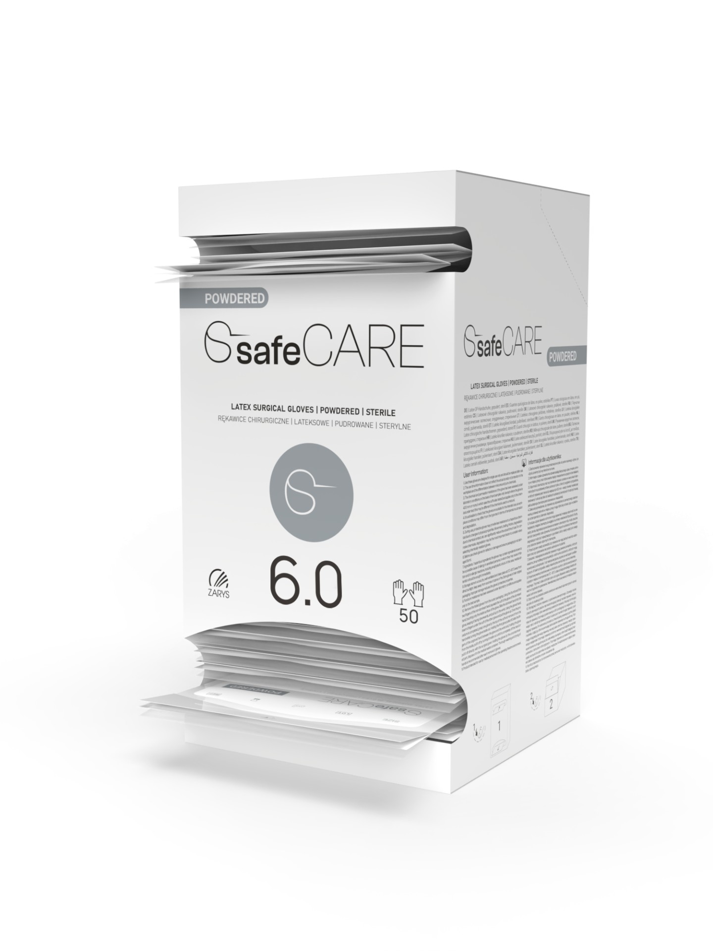 A SafeCARE steril, púderes műtéti kesztyű orvostechnikai eszköz és egyéni védőeszköz, amely a műtéti környezetben biztosítja a kéz védelmét. A kesztyű belül púderezett, kívül texturált. Párban csomagoltan, 50 pár kesztyű van az egységcsomagban, amely egyben egy praktikus adagolódoboz is.