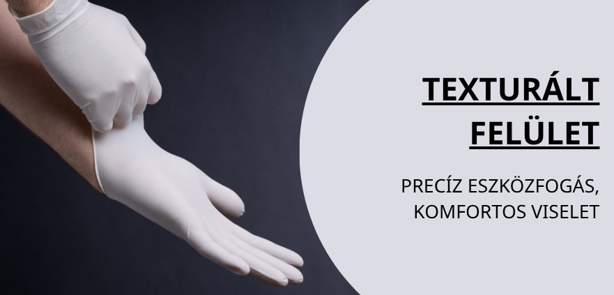 A kesztyűk texturált felülete jelentős előny, különösen olyan környezetben, ahol a precíz, biztos eszközfogás kulcsfontosságú. A kesztyű jobb tapadást biztosít – mind száraz, mind nedves környezetben. Ez különösen fontos az orvosi ágazatban, laboratóriumokban, ahol a fogás stabilitása elengedhetetlen.